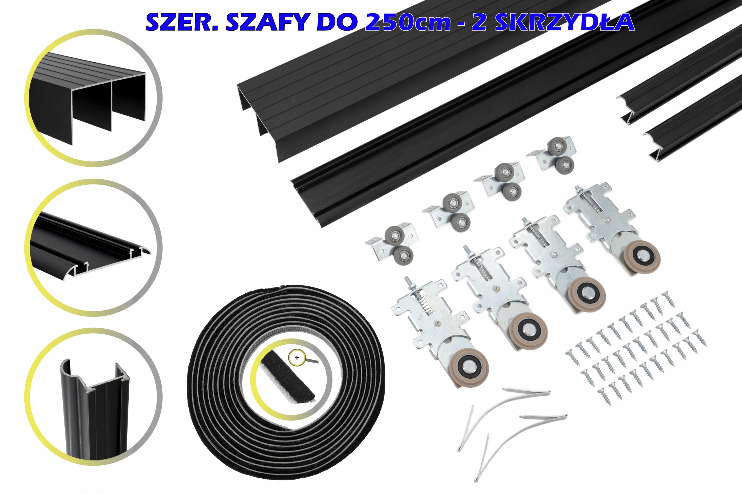 Przedmiotem aukcji jest system przesuwny do szafy dwuskrzydłowej szerokości do 250cm w kolorze czarnym z rączkami (profile pionowe)