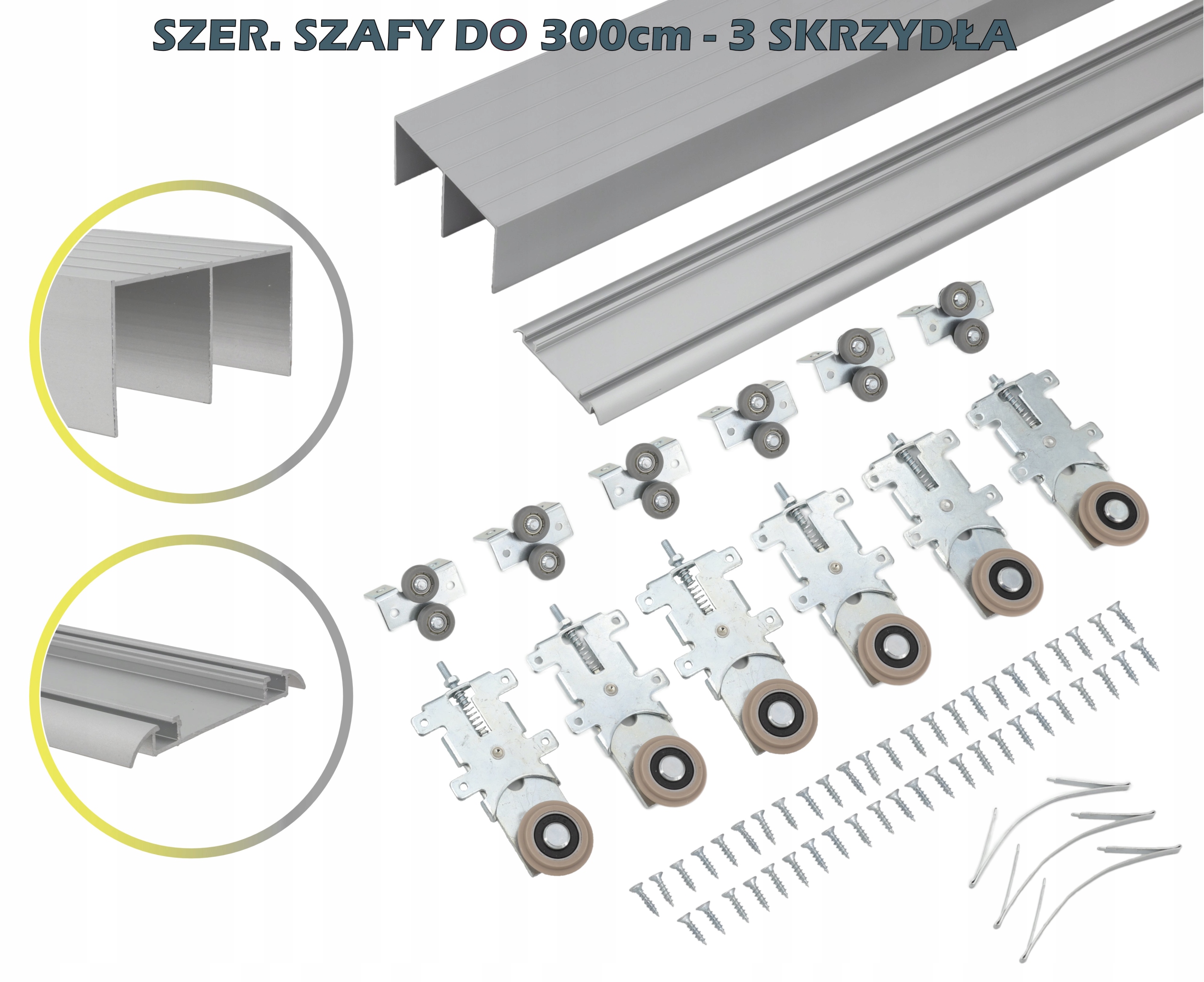 Przedmiotem aukcji jest system przesuwny do szafy trzyskrzydłowej szerokości do 300cm w kolorze SREBRNYM.