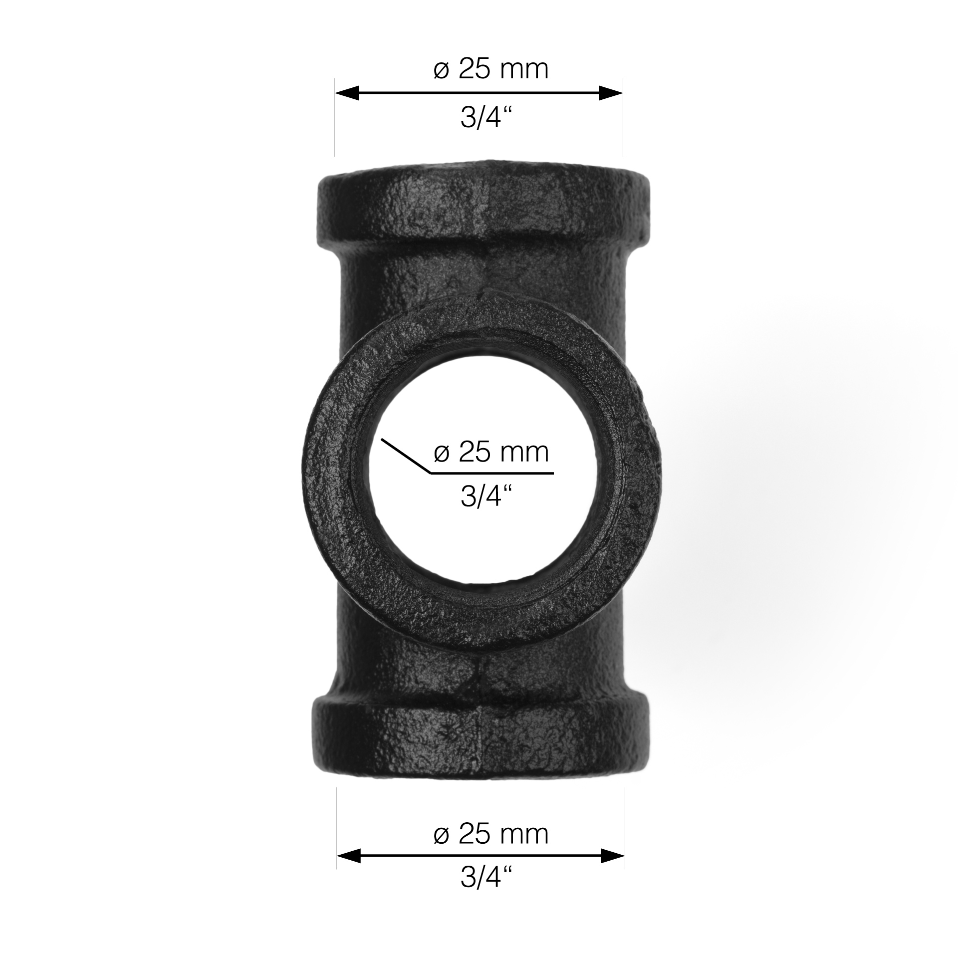 Czwórnik wyposażony jest w gwinty wewnętrzne, w które wkręca się rury, korki, zaślepki, łączniki i inne elementy systemu LoftLine TUBE.