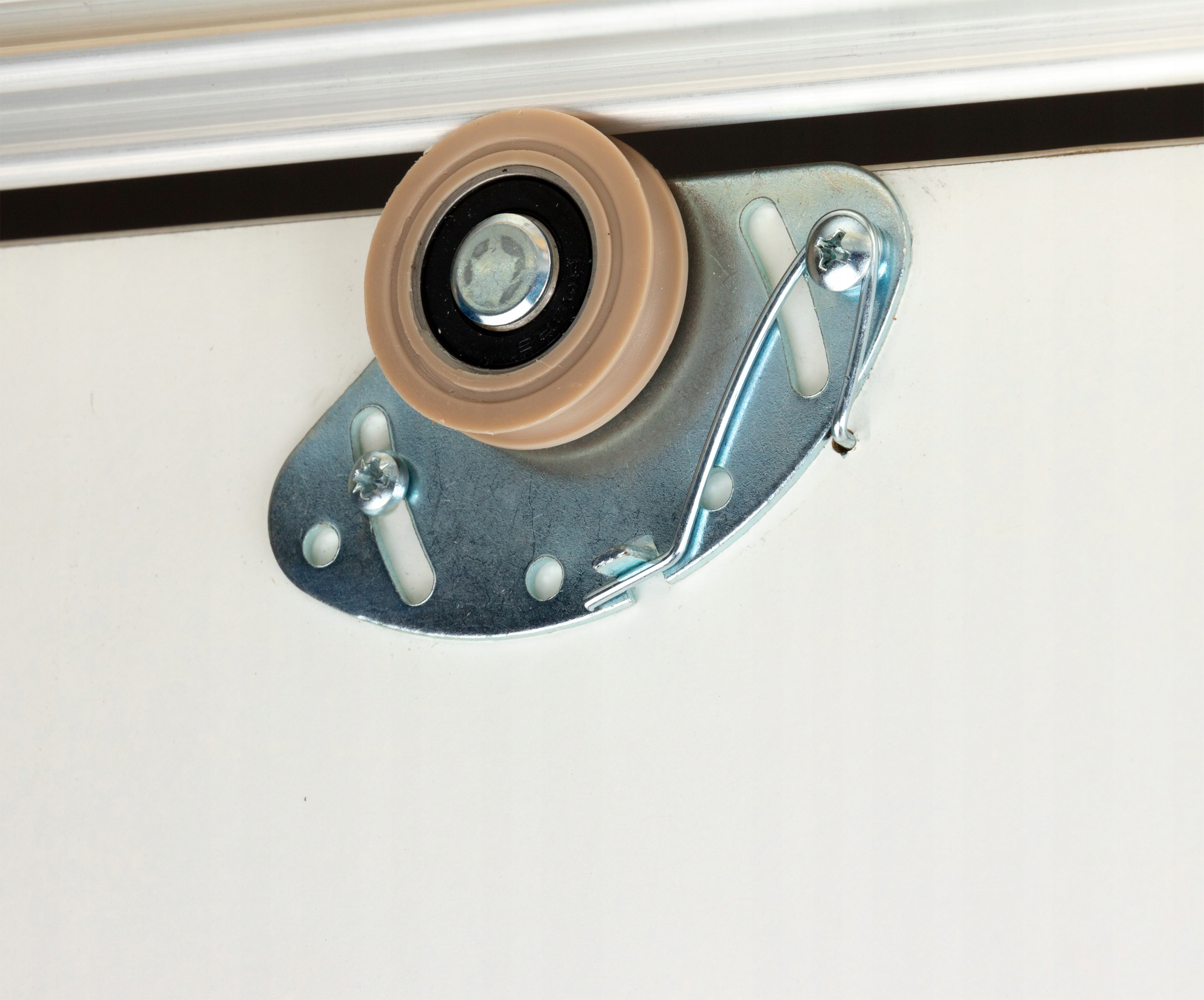 Dzięki zastosowanym wózkom unikamy zjawiska wypadnięcia skrzydła szafy szczególnie w przypadku nierówności sufitu gdyż wózek górny będzie samoczynnie adoptował się do zmieniającej wysokości światła szafy.