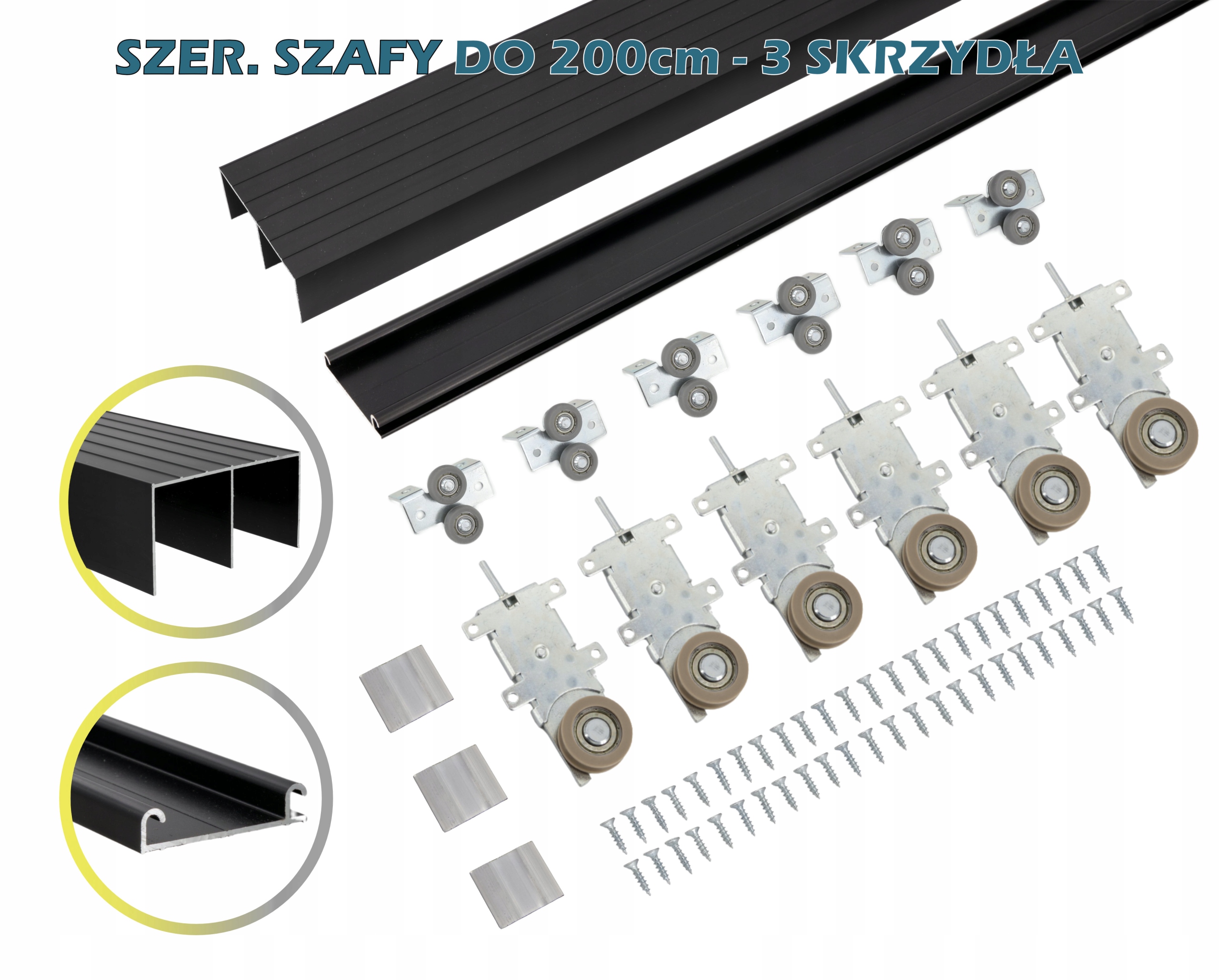 Przedmiotem aukcji jest system przesuwny do szafy trzyskrzydłowej szerokości do 200cm w kolorze czarnym