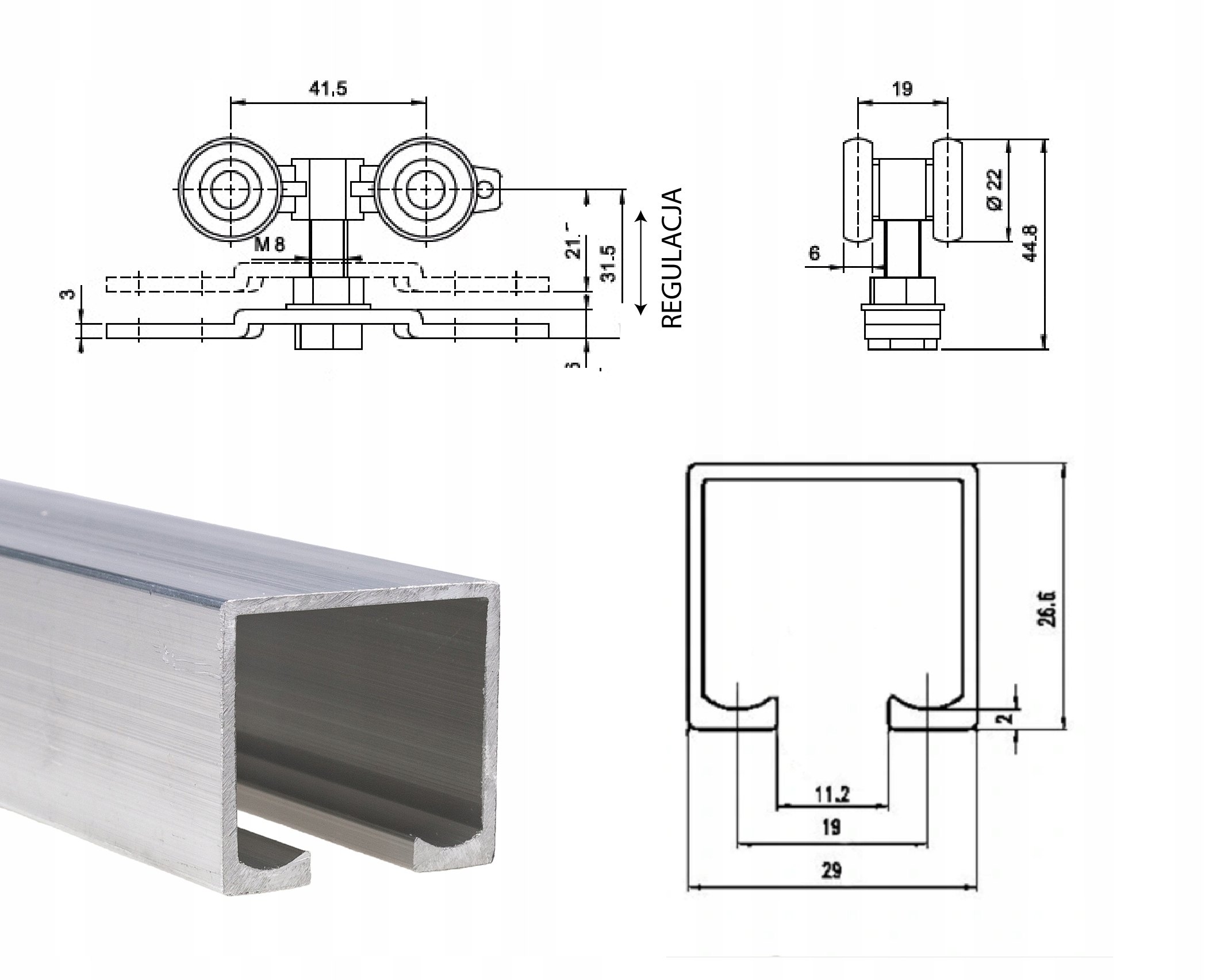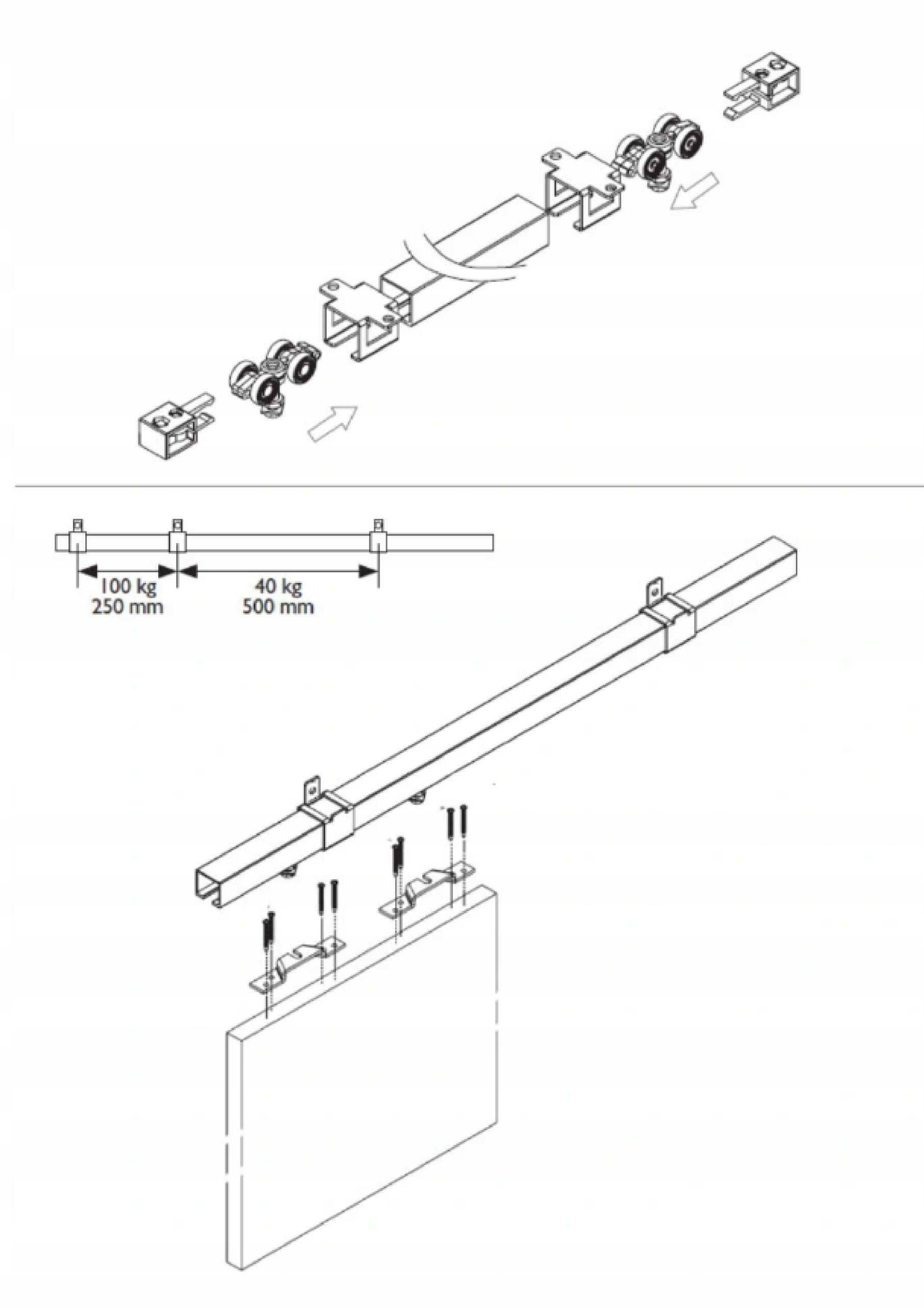 Wózki można także stosować z torami innych producentów o wyglądzie i wymiarach jednakowych z przedstawionymi na sąsiednich grafikach
