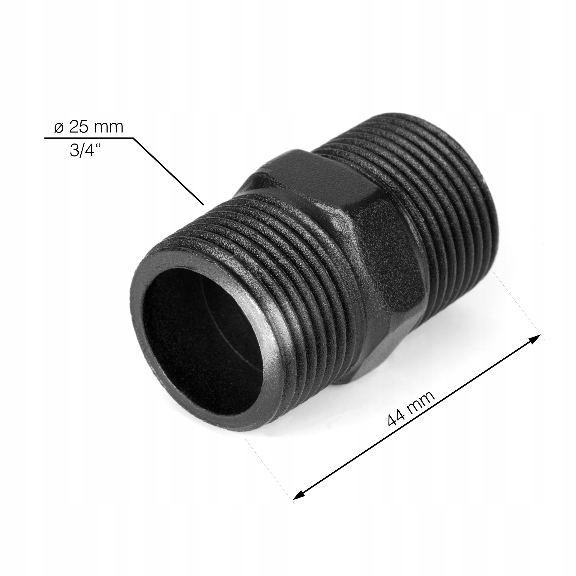 Łącznik wyposażony jest w gwinty zewnętrzne, na które nakręca się rozety, mufy, trójniki, kolana i inne elementy systemu LoftLine TUBE.
