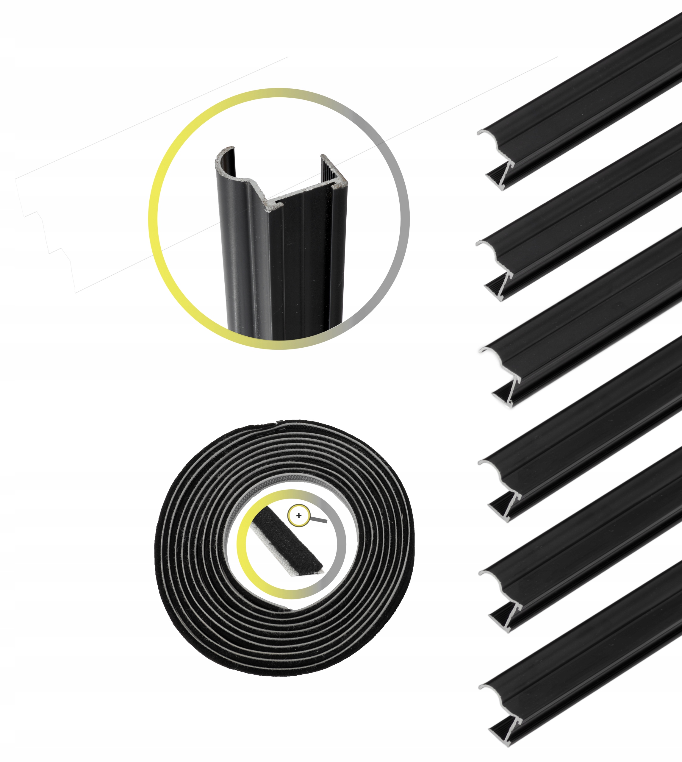 Przedmiotem aukcji jest komplet 6szt. rączek (profili pionowych) do szaf przesuwnych dwuskrzydłowych lakierowanych w kolorze czarnym RAL 9005 do skrzydeł grubości 18mm