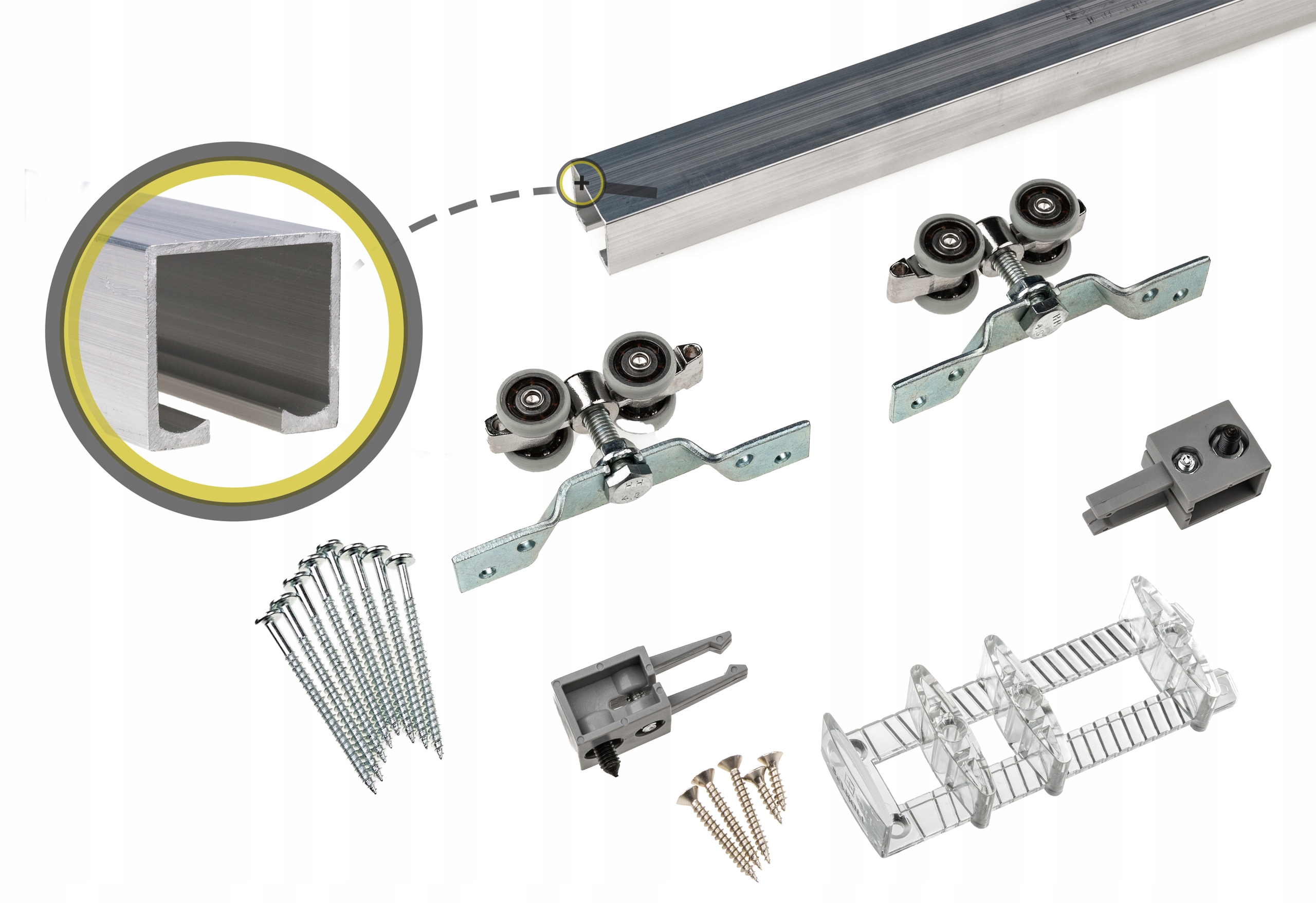 Klamra sufitowa – służy do montażu prowadnicy do sufitu ( jej użycie jest konieczne w przypadku chęci zastosowania domykacza w systemie mocowanym do sufitu)