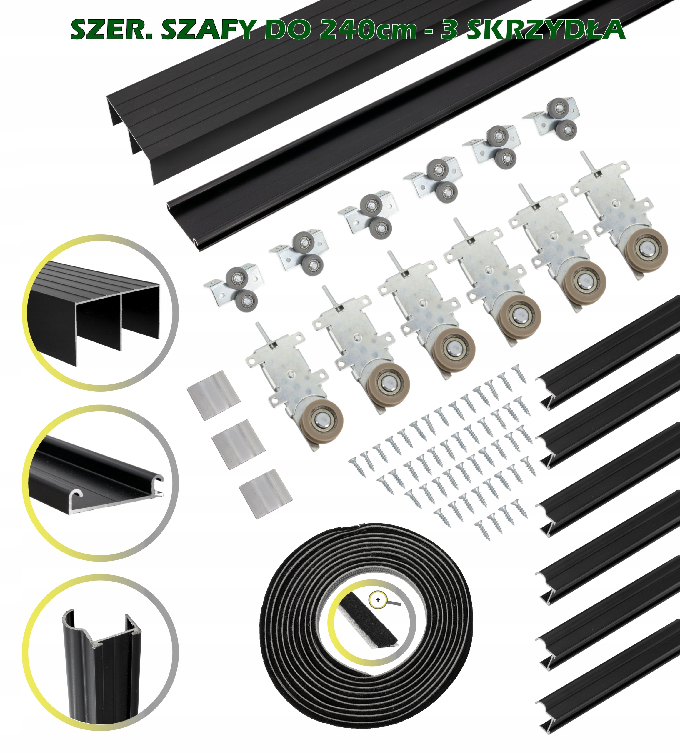Przedmiotem aukcji jest system przesuwny do szafy trzyskrzydłowej szerokości do 200cm w kolorze czarnym z rączkami (profile pionowe)