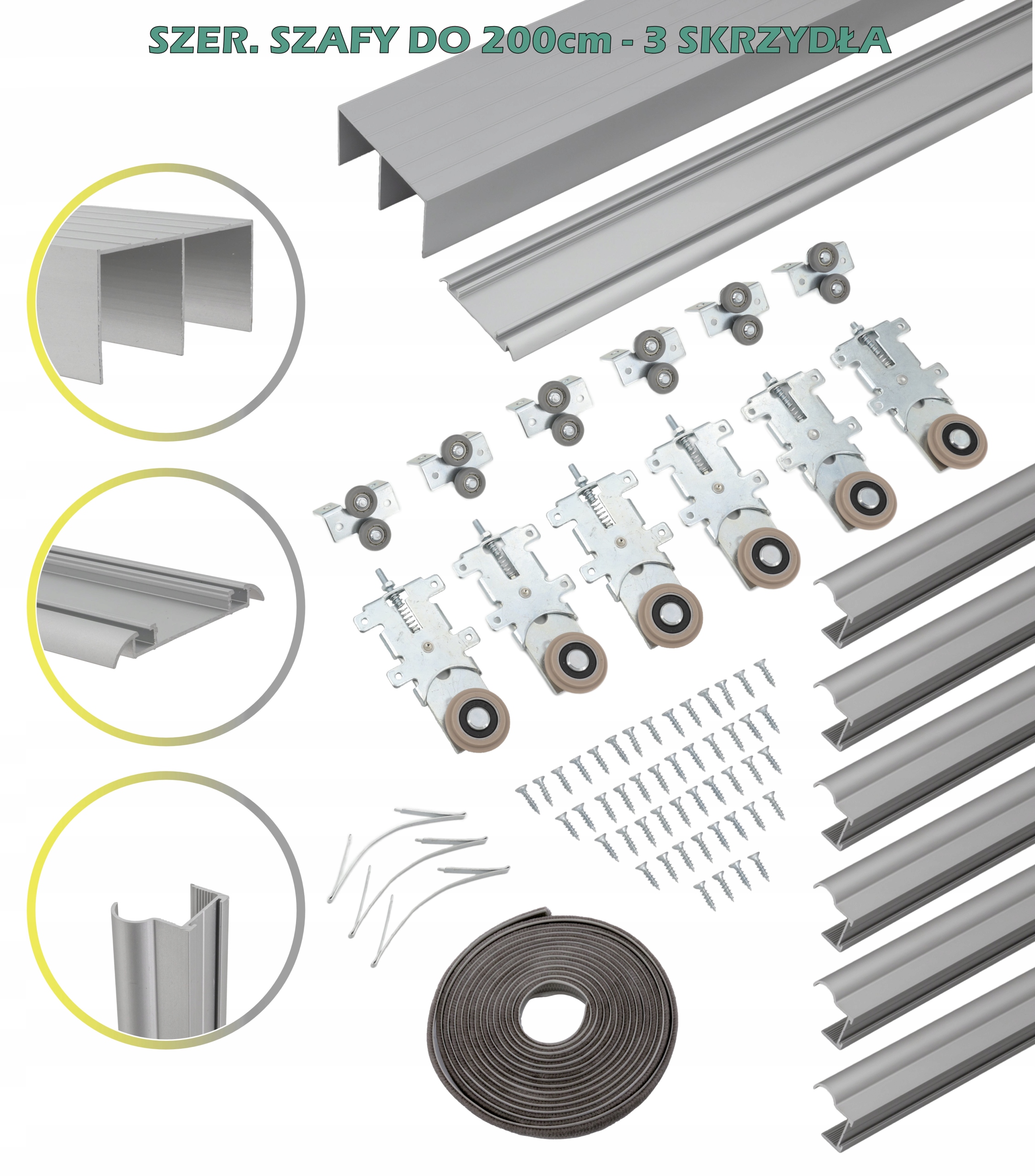 Przedmiotem aukcji jest system przesuwny do szafy trzyskrzydłowej szerokości do 200cm w kolorze srebrnym z rączkami (profile pionowe)