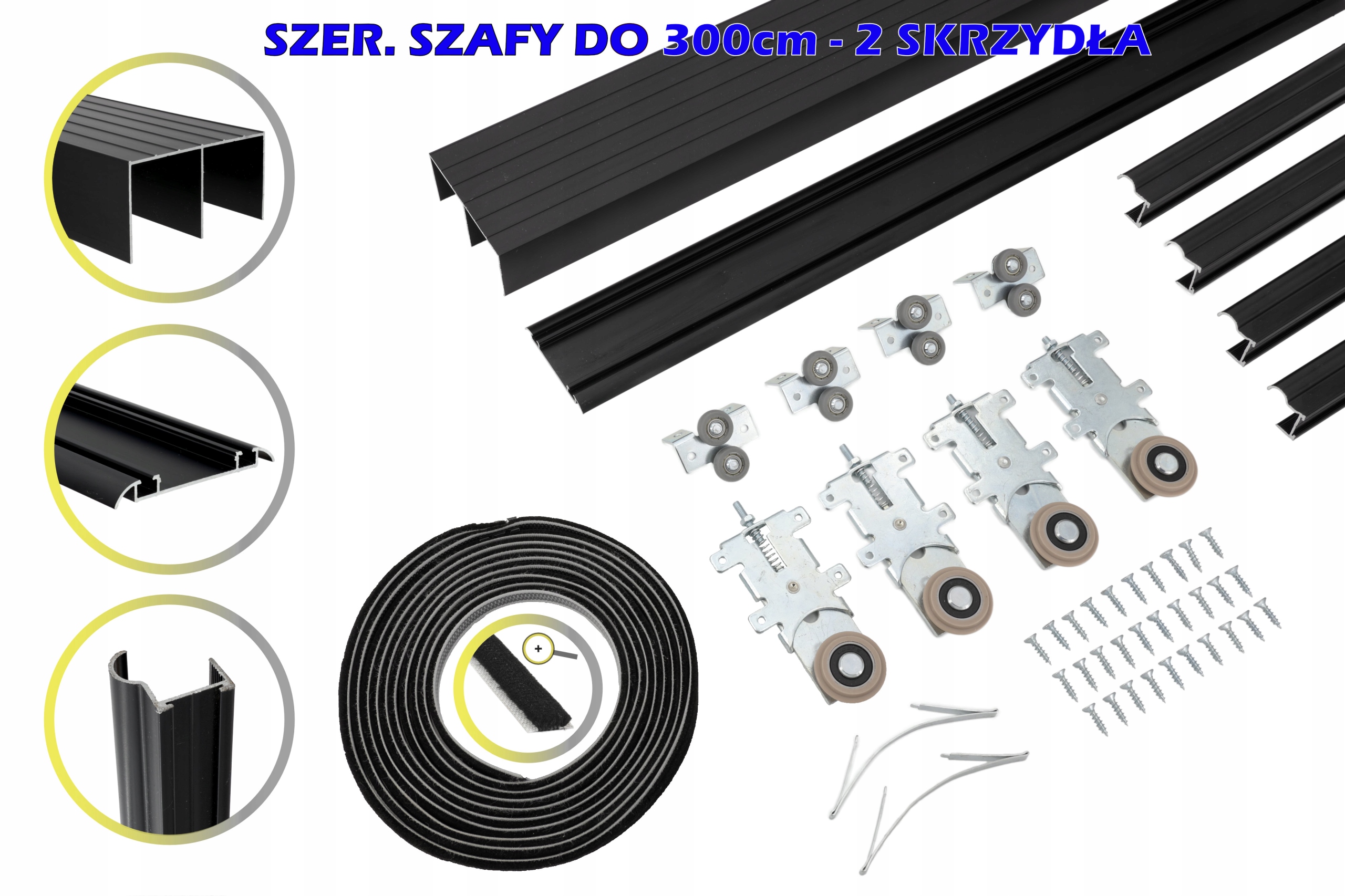 Przedmiotem aukcji jest system przesuwny do szafy dwuskrzydłowej szerokości do 300cm w kolorze czarnym z rączkami (profile pionowe)