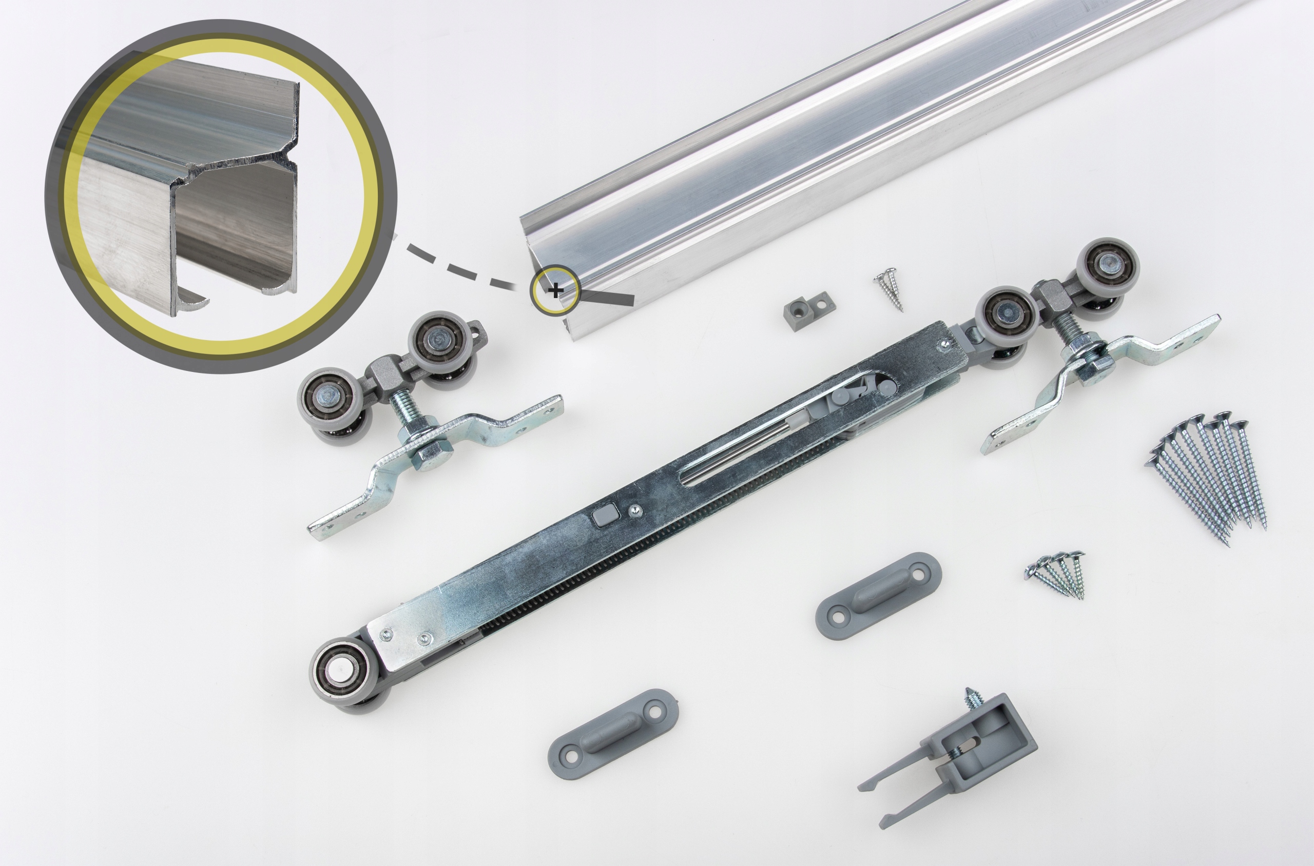 Oferowany na tej aukcji zestaw zawiera wózek ze zintegrowanym domykaczem jednostronnym zapewniającym wyjątkowo ciche i płynne domykanie drzwi w jednym kierunku.
