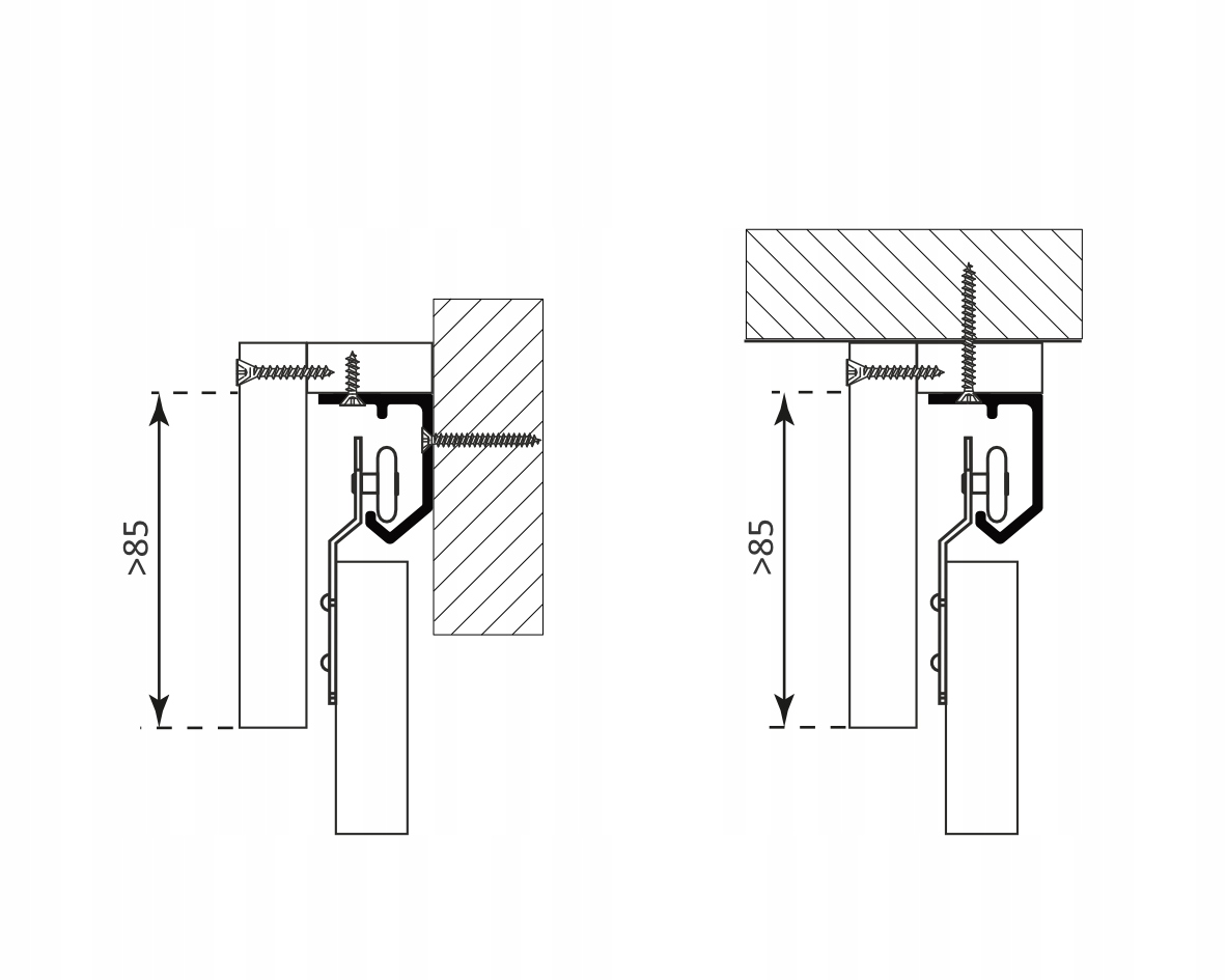 System ten nie posiada dedykowanej maskownicy można natomiast wykonać ją samodzielnie wg. sąsiedniego schematu poglądowego , co doskonale sprawdza się szczególnie w przypadku drzwi wykonanych z płyty meblowej.